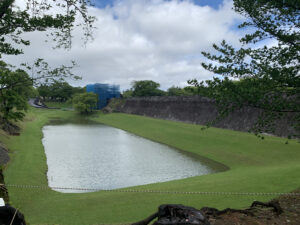熊本城に到着してまず目に入るのが、広大な堀と石垣です。写真に写る池のような堀は、かつて城を守る重要な防御施設でした。堀の向こうには高い石垣がそびえ、その上に城の建造物が見えます。