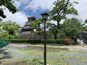 別の角度から見ると、橋の先に堂々とそびえる熊本城天守閣の全貌が現れます。木々の緑と黒い天守閣のコントラストが美しく、春の熊本城の魅力を存分に感じることができます。
