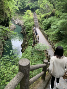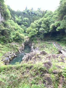 高千穂峡には、峡谷に沿って整備された遊歩道があり、様々な角度から絶景を楽しむことができます。写真に写る橋は、峡谷を横断する遊歩道の一部で、この橋から見下ろす景色も絶景です。