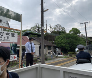 南阿蘇鉄道のトロッコ列車に乗るため、高千穂駅を訪れました。写真に写る駅のホームは、ローカル鉄道らしいこじんまりとした雰囲気で、駅員さんが丁寧に案内をしてくれます。