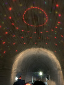 さらに驚いたのが、トンネル内の演出です。写真のように、トンネルの天井には色とりどりのLEDライトが設置されており、列車が通過する際に幻想的な光のショーが楽しめます。