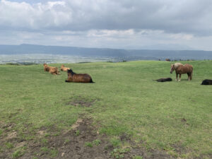 遠くには阿蘇の山々が連なり、その雄大さに圧倒されます。空は曇り空ですが、それが逆に阿蘇の大地の広さを強調し、どこまでも続く草原の美しさを引き立てています。