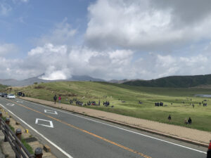 旅の最終日は、九州を代表する活火山・阿蘇山へ向かいました。阿蘇山は、世界でも有数の大きさを誇るカルデラ(巨大な窪地)を持つ火山で、南北25キロメートル、東西18キロメートル、周囲128キロメートルという壮大なスケールを誇ります。