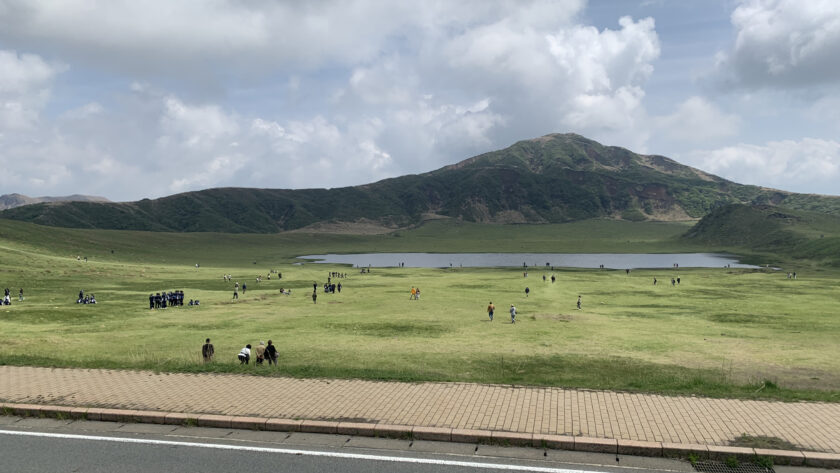 写真では、広大な草原と奥に連なる阿蘇の山々、そして空に浮かぶ雲の美しい景色が捉えられています。草原には多くの観光客が訪れ、それぞれに写真撮影や散策を楽しんでいます。